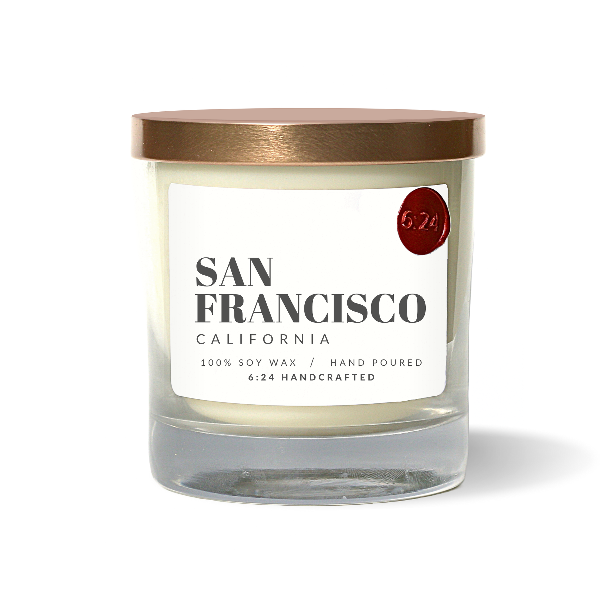 This 10 oz. San Francisco, California candle represents the city well with notes of misty waters, golden amber, citrus, musk, salt, and peppercorn. Imagine waking up just before the sun rises in San Francisco to see the beautiful foggy mist surrounding Alcatraz and the Golden Gate Bridge before the Giants hit home runs into McCovey Cove that evening.